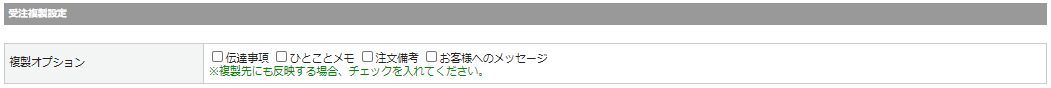 | 複製オプション | 「受注管理>受注一覧」にて【複製】ボタンから受注複製をする場合に、 追加で複製先にも反映させる情報を指定します。 |