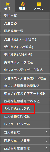 | 入金消込CSV取込後のステータス | 入金消込が完了した受注データは、ここで表示されている受注ステータスに遷移します。 |