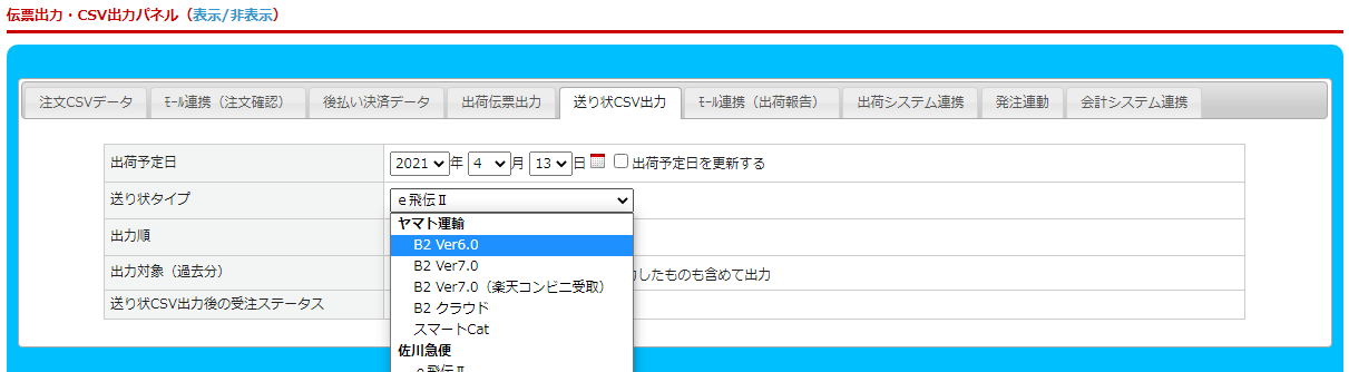 送り状のデータは出せますか 2021年10月6日 受注関連 ■回答内容 ヤマト、佐川急便などの送り状印刷ソフトに取込むデータを一括で出力することができます。 受注>受注一覧 伝票出力・CSV出力パネル この記事で解決しましたか? 〇 はい 0 × いいえ 3 「納品書は出せますか」 「「住所注意」と表示される場合について」