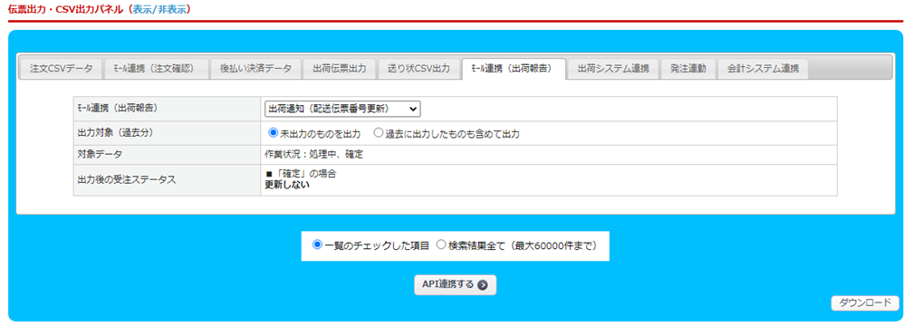 伝票出力・CSV出力パネル>モール連携(出荷報告)タブより連携可能です。