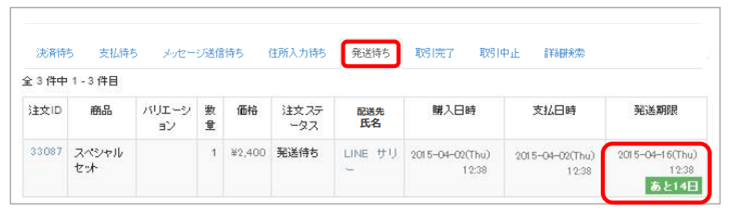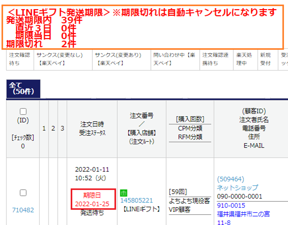 LINEギフト管理画面の発送期限日(支払日の14日後)が受注一覧画面に表示されます。