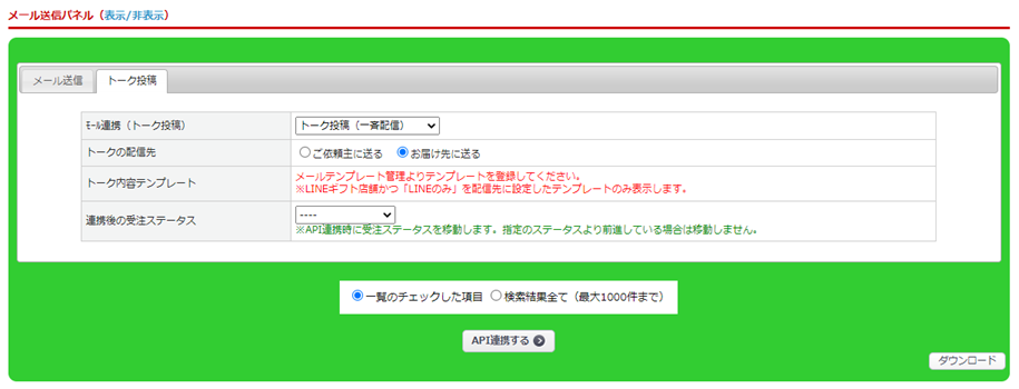 | 連携後の受注ステータス | トーク投稿後のステータスを選択します。【必須】 |