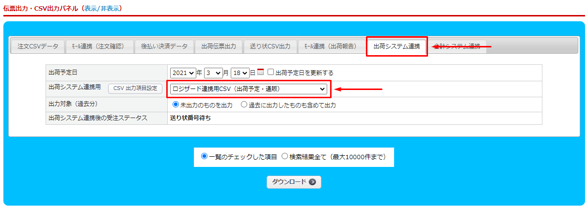 出荷システム連携用のプルダウンより「ロジザード連携用CSV(出荷予定・通販)」を選択してCSVを出力します。