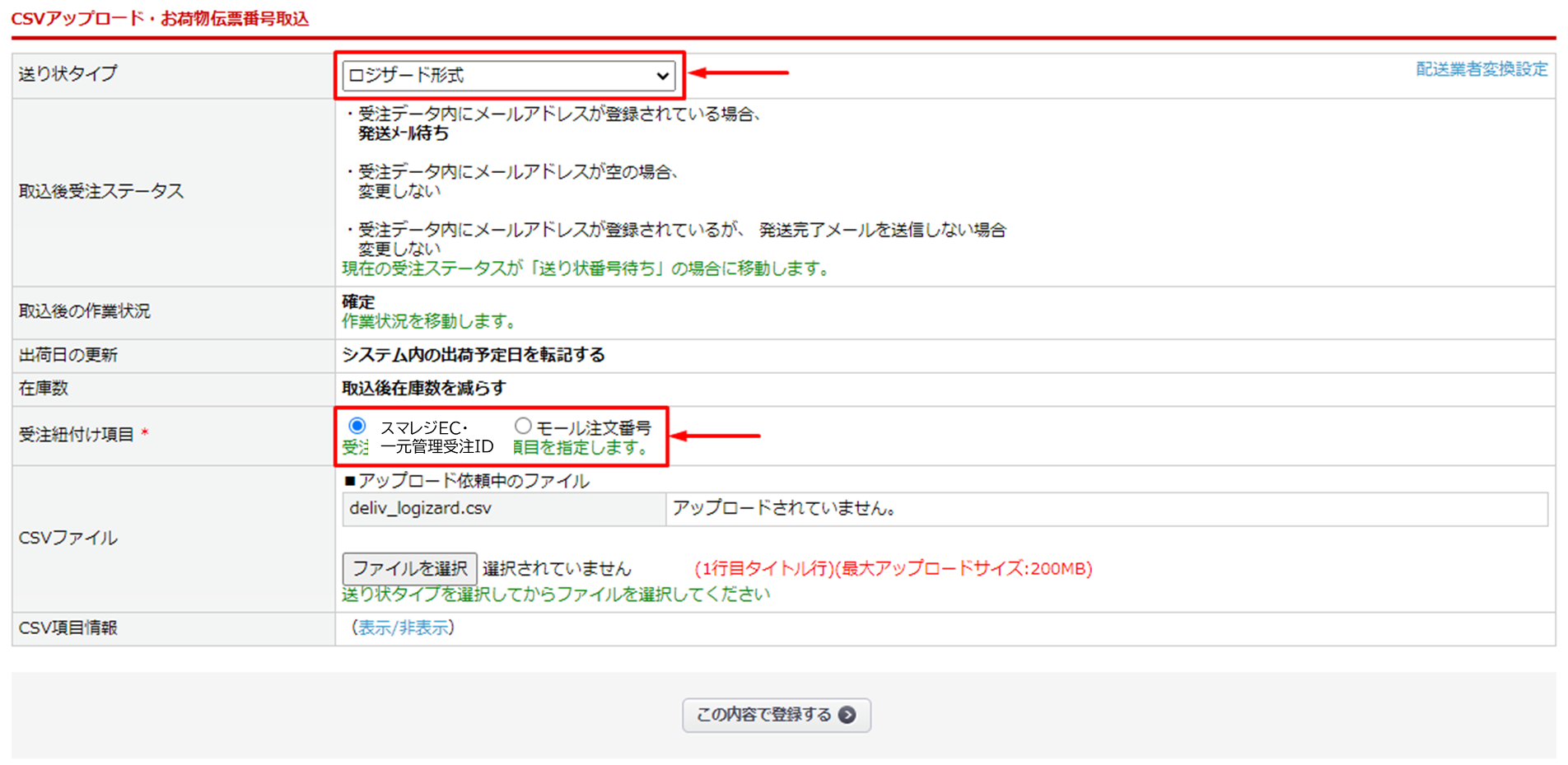 ロジザード連携用の出荷CSV出力、ロジザード形式のお荷物伝票番号CSVを取り込むことができます。