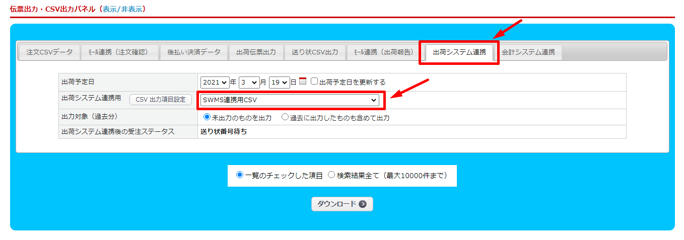 受注管理-SWMS連携 2021年8月20日 受注関連 ※こちらの機能は、受注管理-SWMS連携機能導入時のみ利用できます。 ご利用をご希望の場合は、サポートまでご連絡ください。 ページ内コンテンツ概要出荷CSV出力手順 概要 SWMS(佐川WMS)連携用のCSVを出力することができます。 出荷CSV出力手順 受注>受注一覧>伝票出力パネル「出荷システム連携タブ」にて出荷システム連携用のプルダウンより「SWMS連携用CSV」を選択してCSVを出力します。 ※詳細なCSV出力手順はこちらの記事をご覧ください。 この記事で解決しましたか? 〇 はい 0 × いいえ 0 「受注処理」 「モールごとに配送情報を自動連携する手段を知りたい」