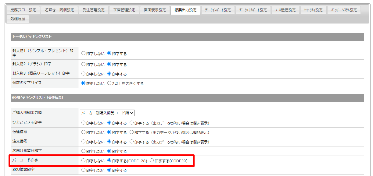 個別ピッキングリスト(受注伝票)>バーコード印字「印字する(CODE128)」または「印字する(CODE39)」を選択し、【この内容で登録する】をクリックしてください。