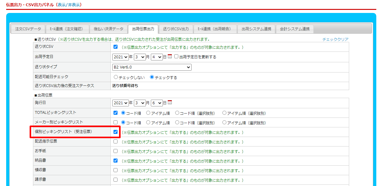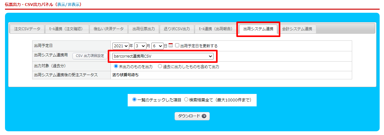 受注>受注一覧>伝票出力・CSV出力パネル「出荷システム連携」タブ