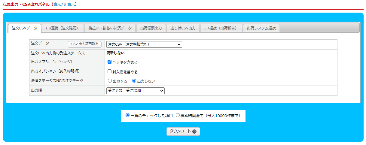 | 注文データ | データ形式を選択してください。 【CSV出力項目設定】ボタンから「カスタムCSV設定」が可能です。 |