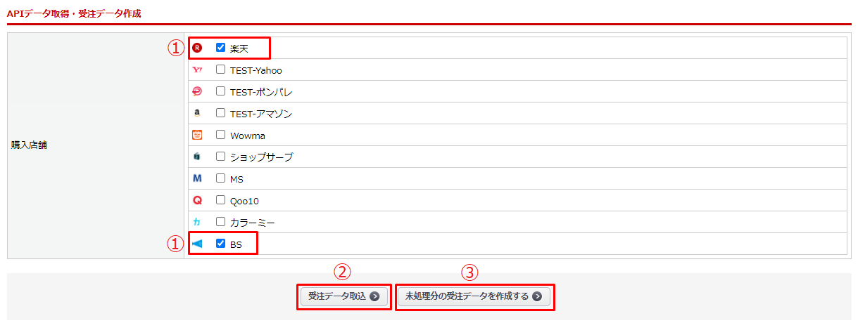 1.受注データを取り込む購入店舗にチェックを入れる。