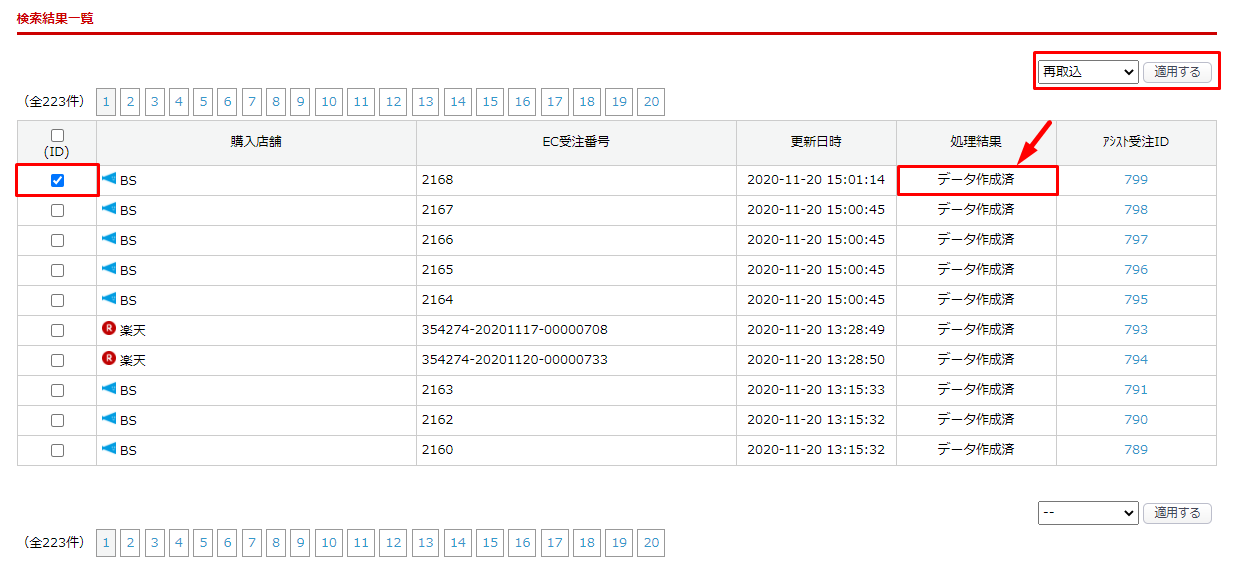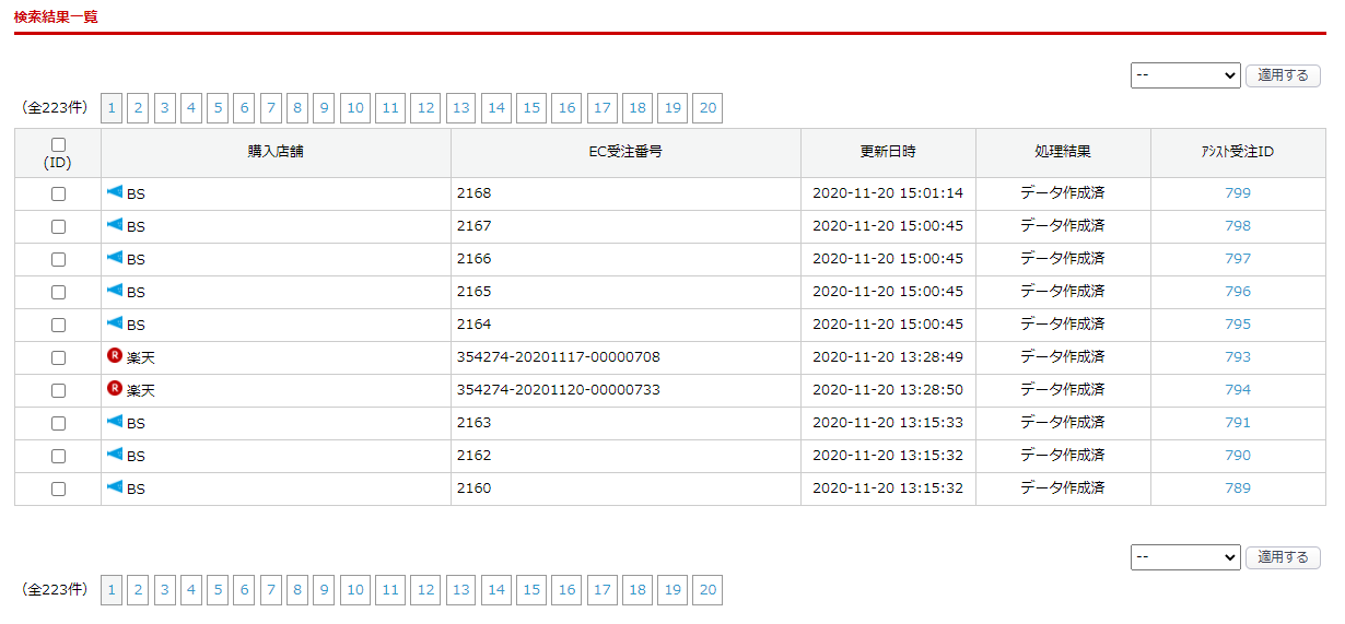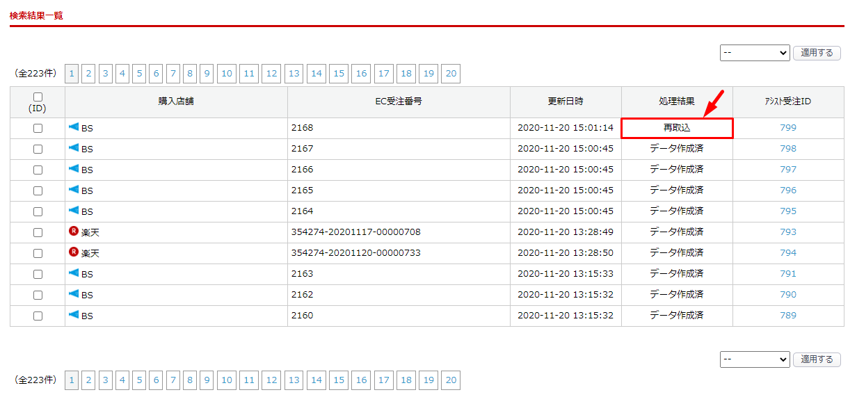 一覧に表示されている受注データ履歴の「処理結果」を任意で変更可能です。
