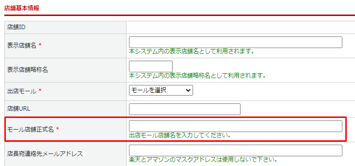 受注取込を利用の際は、環境設定>店舗設定>「店舗情報」タブ の「モール店舗正式名」に取込元の店舗名を正しく登録する必要があります。
