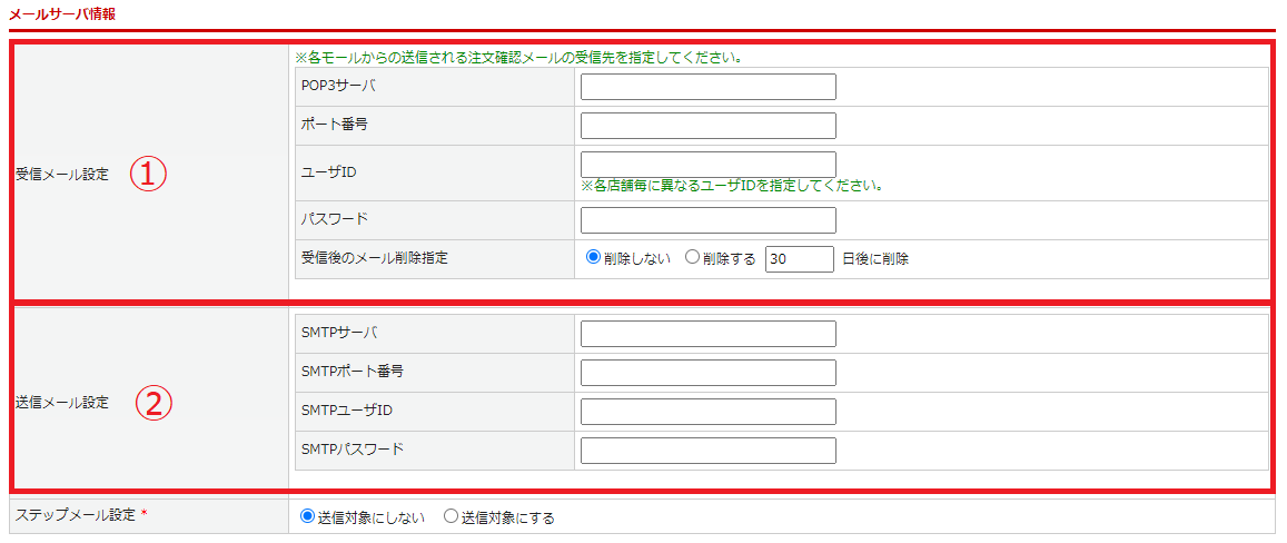 | ①受信メール設定 | 各モールに設定したメールアドレス情報を設定 ※「受信後のメール削除指定」項目は、必ず[削除する]を選択し、日数を2~5日以内を推奨します。 なお、メールの削除設定を行ってもスマレジEC・一元管理に取り込まれたメールデータは削除されません |