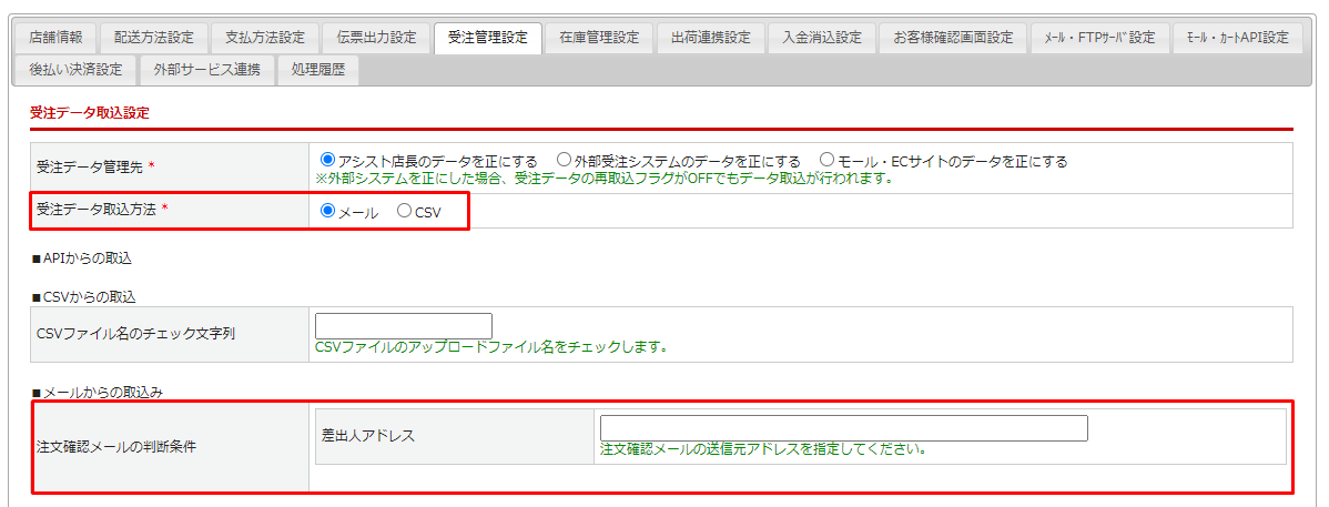 環境設定>店舗設定>[受注管理設定]タブ>受注データ取込設定 から