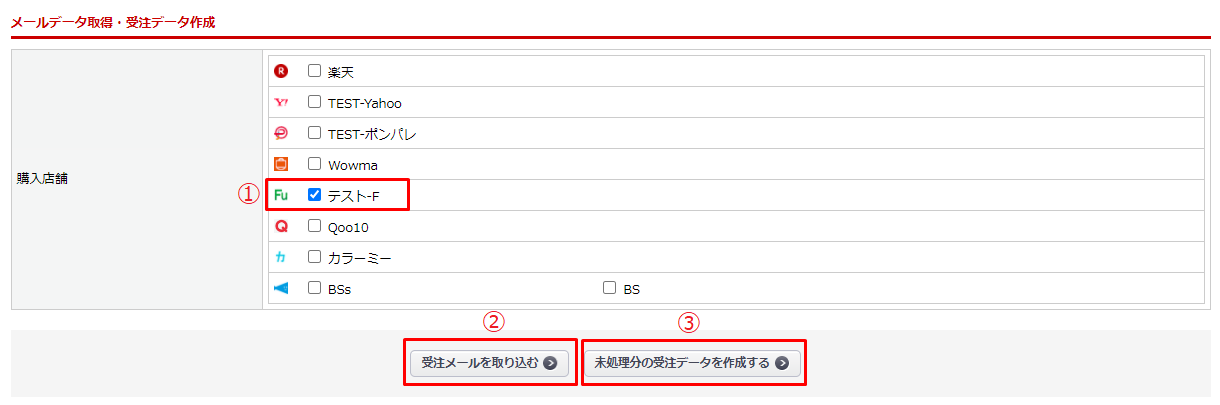 1.受注データを取り込む購入店舗にチェックを入れる。