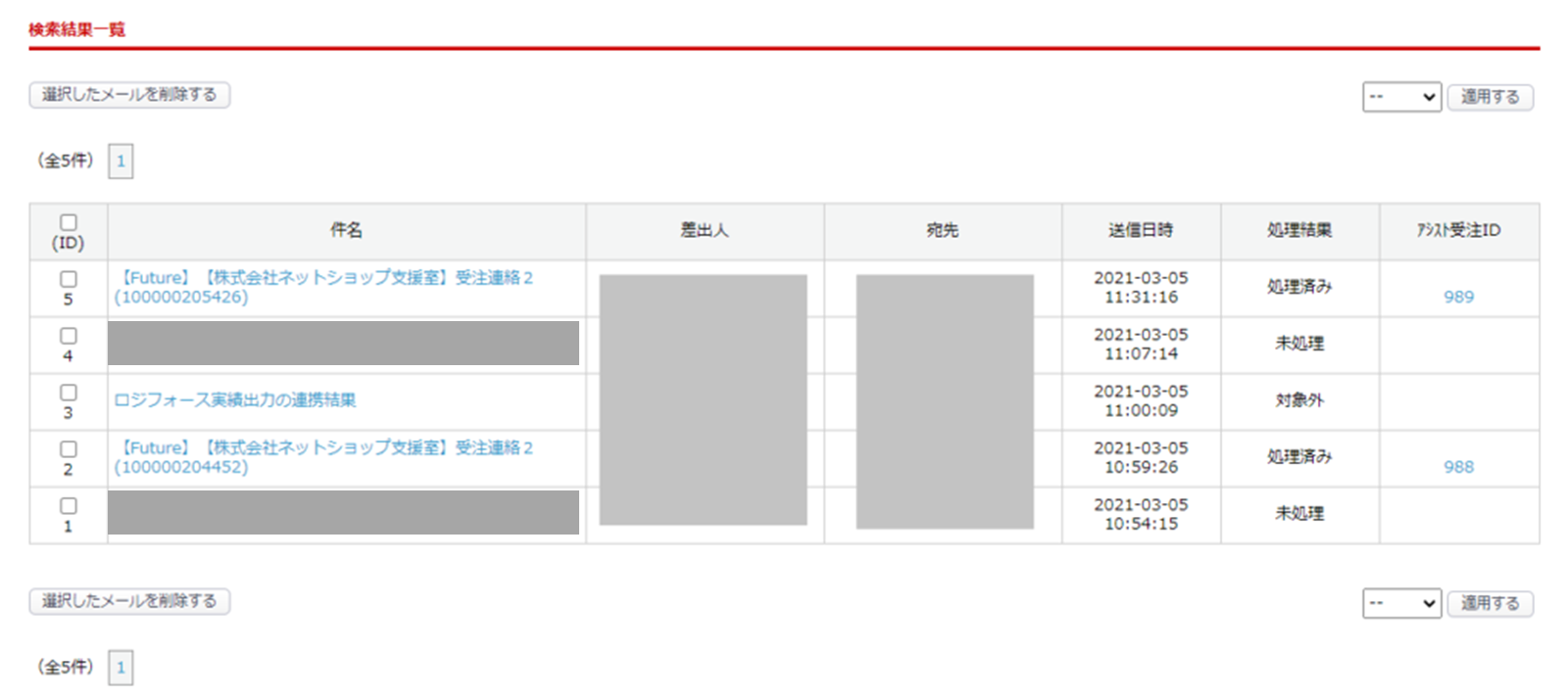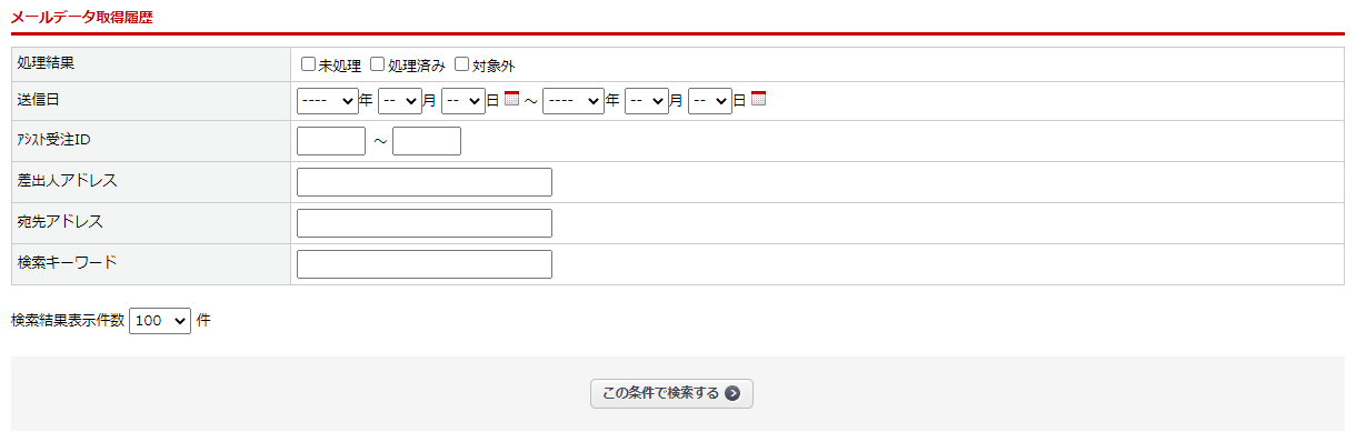 スマレジEC・一元管理に取り込んだメールデータの取得履歴を絞り込み検索できます。