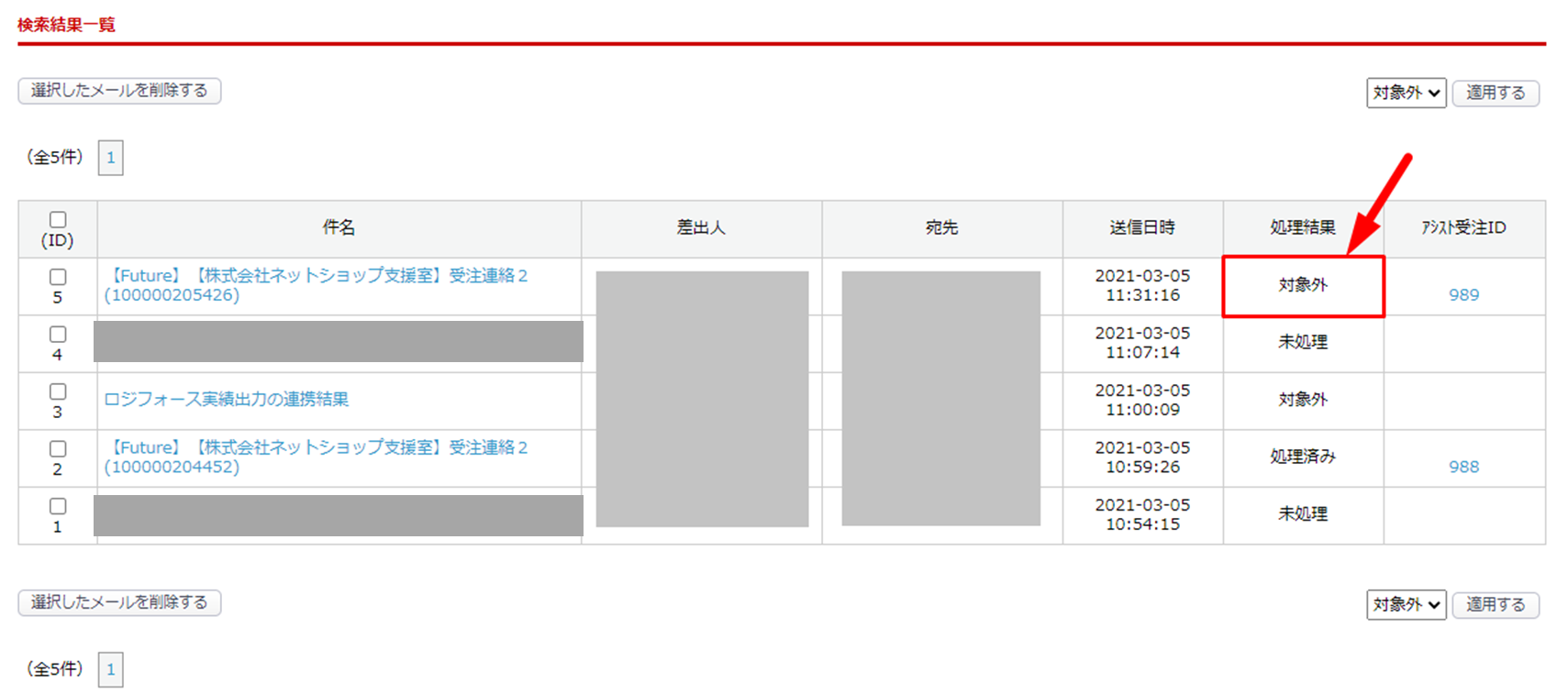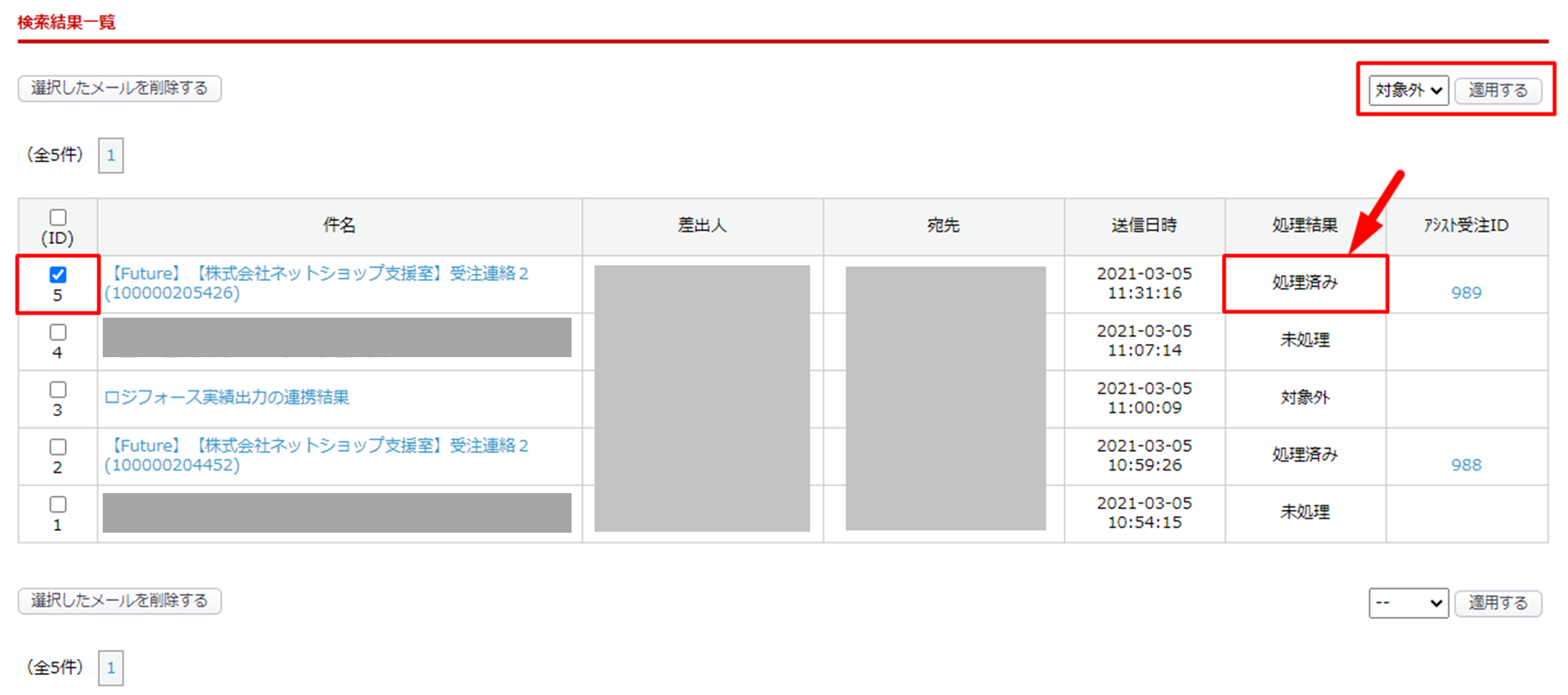 2.右上、または右下のプルダウンから処理結果を選択し、【適用する】ボタンをクリックします。