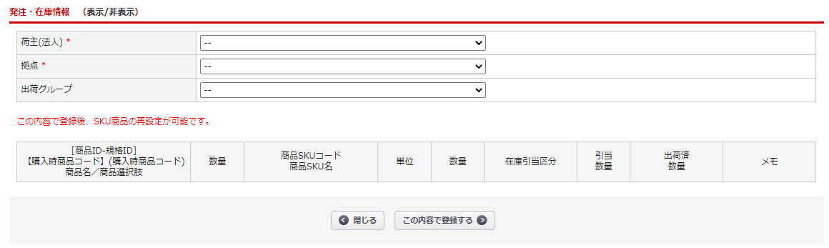 「在庫引当区分」「メモ」欄を設定して、【SKU商品の再設定】ボタンをクリックすることで登録されます。