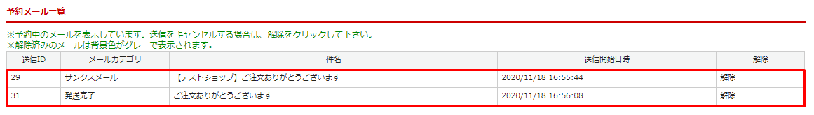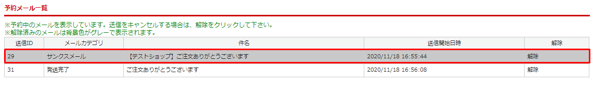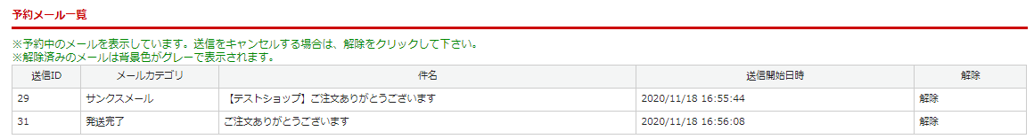 受注>受注登録>予約メール解除 2021年8月19日 受注 【目次】・概要・予約メール解除 ページ内コンテンツ概要予約メール解除予約メール一覧予約メール解除 概要 受注に紐づく予約メールを表示します。また、予約送信の解除が可能です。受注登録>「予約メール解除」タブ 予約メール解除 予約メール一覧 受注に紐づく予約メールを一覧で表示します。 予約メール解除 「解除」をクリックすることで予約メールの解除が可能です。解除済みのメールは背景色がグレーで表示されます。 ※解除済み この記事で解決しましたか? 〇 はい 0 × いいえ 0 「受注>受注一覧」 「MailDealer連携(メールディーラー)」