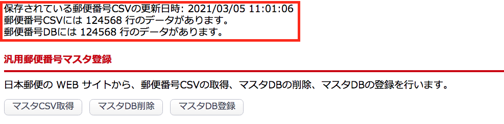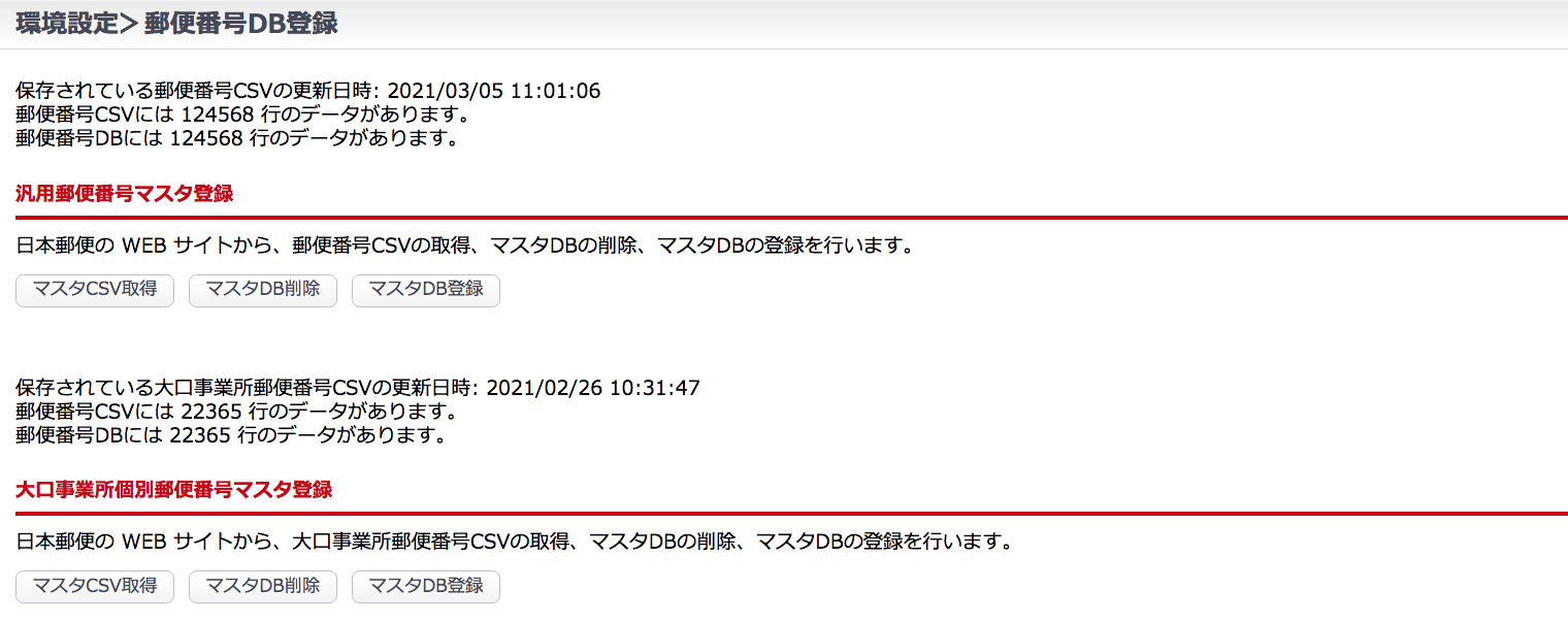 郵便番号と住所等を対応させたデータベース(汎用郵便番号マスタ登録・大口事業所個別郵便番号マスタ登録)のマスタCSVの取得、マスタDB削除、マスタDB登録を行います。