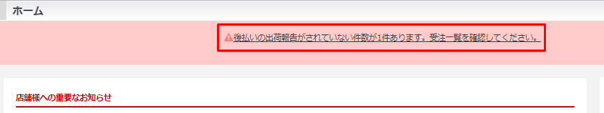 画面別設定>Home画面 にて「後払出荷報告なしの件数表示」を「表示する」に設定してください。