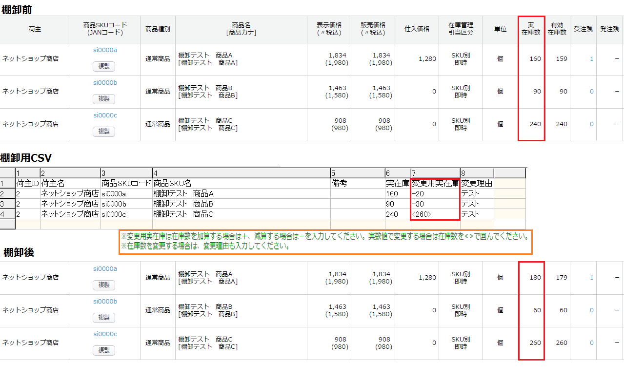 ・実数値で変更する場合は在庫数を<>で囲んでください。