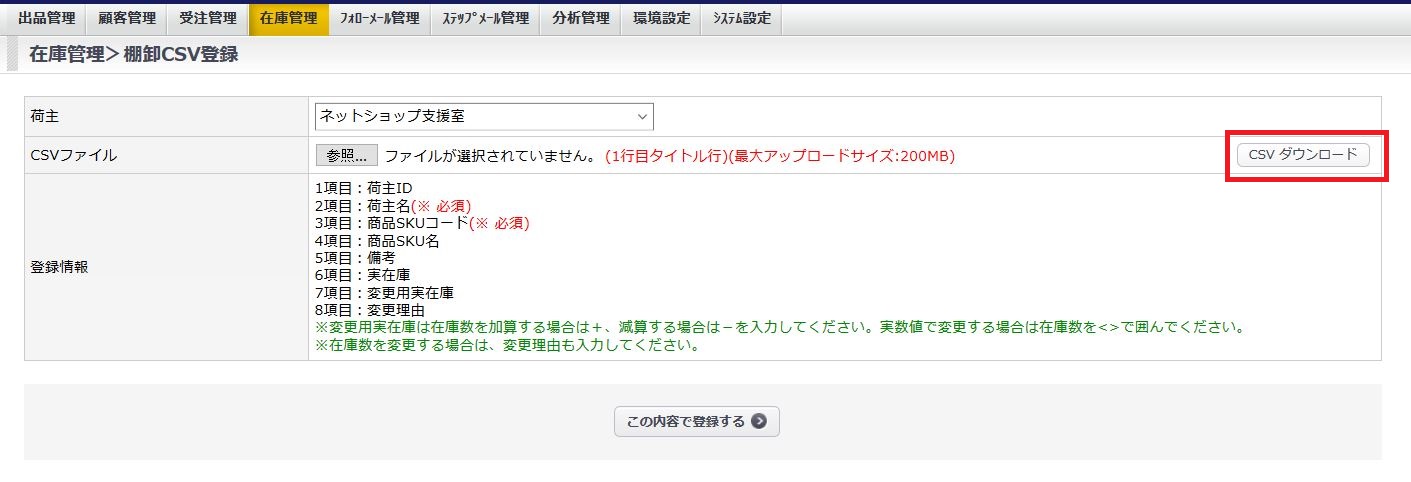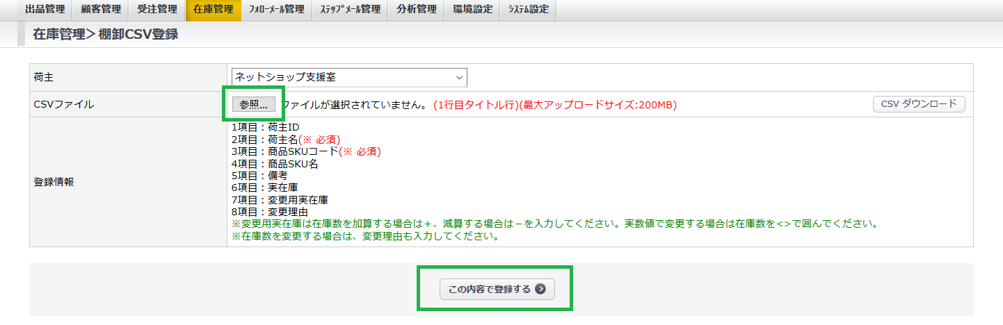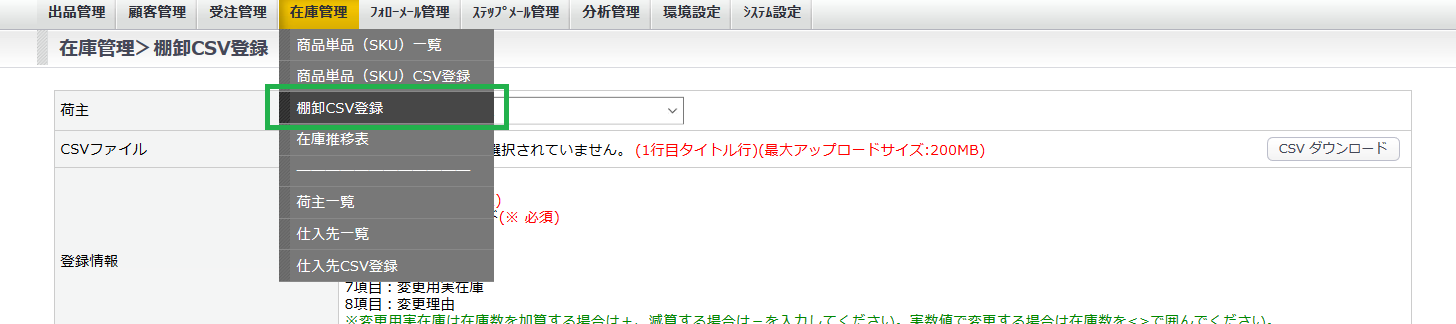 在庫>棚卸CSV登録 より棚卸CSV登録画面に遷移します
