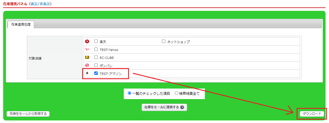 対象商品IDにチェックを入れて、「在庫連携パネル>対象店舗:アマゾン」を選択します。