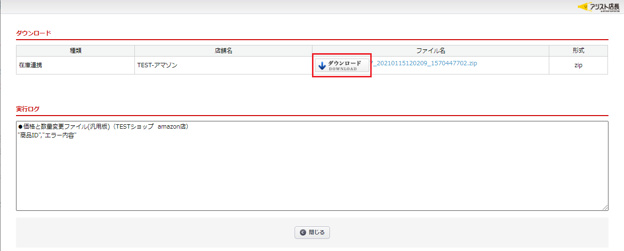右下の【ダウンロード】ボタンより在庫連携用CSVファイルをダウンロードします。
