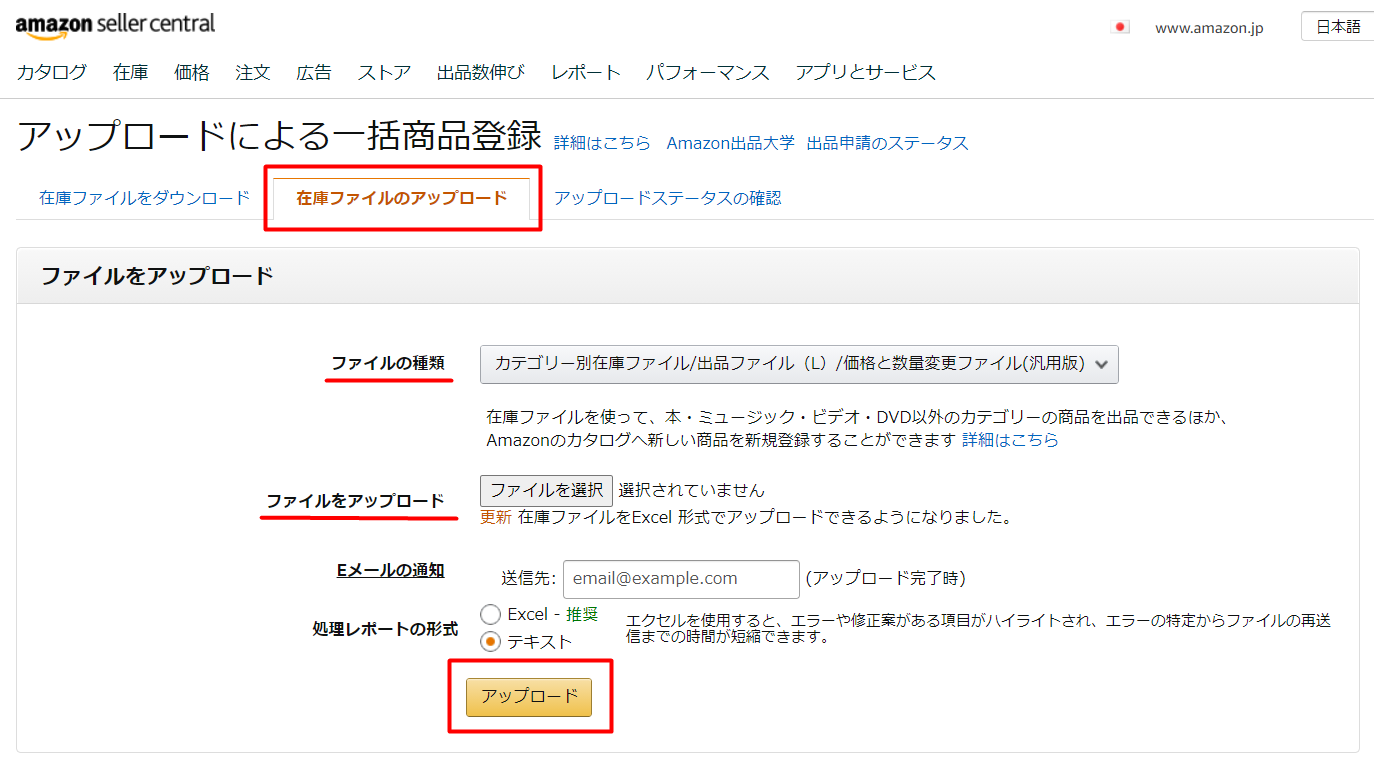 在庫>アップロードによる一括商品登録:在庫ファイルのアップロード にて