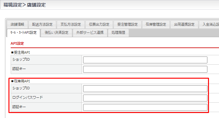 環境設定>店舗設定>「モール・カートAPI設定」タブにて、在庫用APIの設定が必要です。