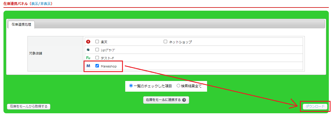 対象商品IDにチェックを入れて、「在庫連携パネル>対象店舗:Makeshop」を選択します。
