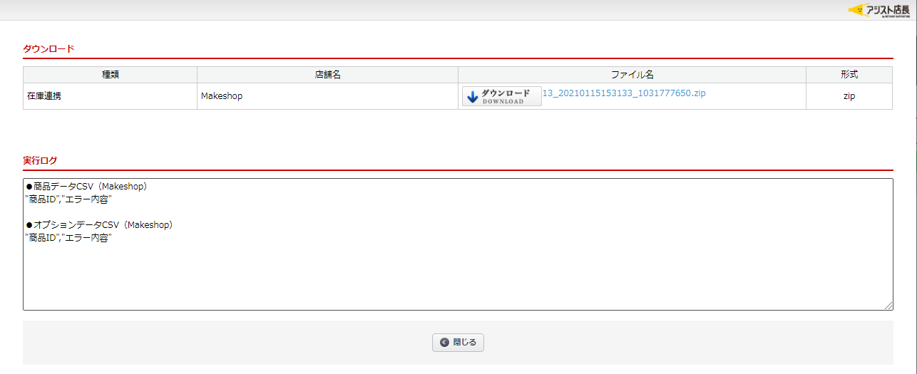 右下の【ダウンロード】ボタンより在庫連携用CSVファイルをダウンロードします。