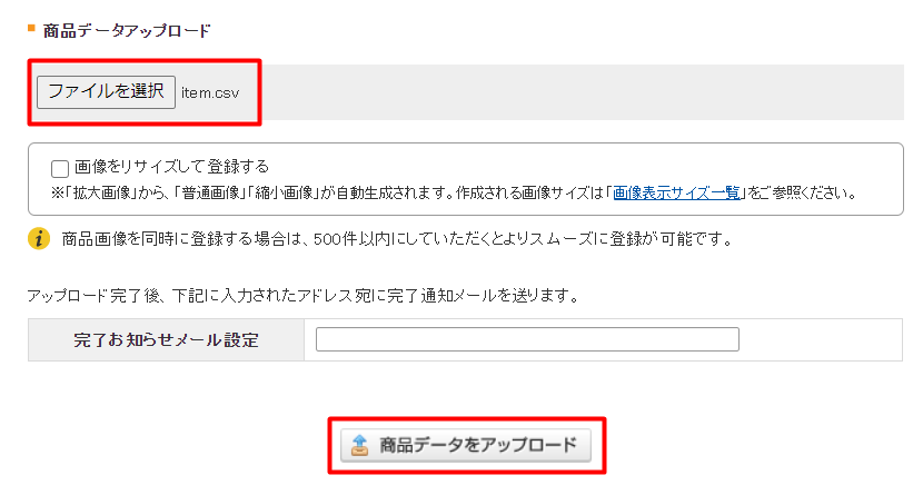 商品管理>CSV一括登録>商品一括登録:商品データアップロード にて