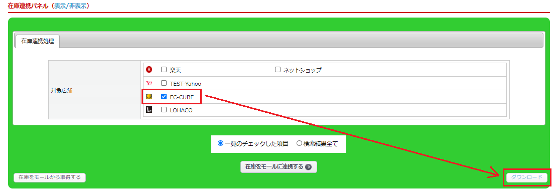 対象商品IDにチェックを入れて、「在庫連携パネル>対象店舗:EC-CUBE」を選択します。