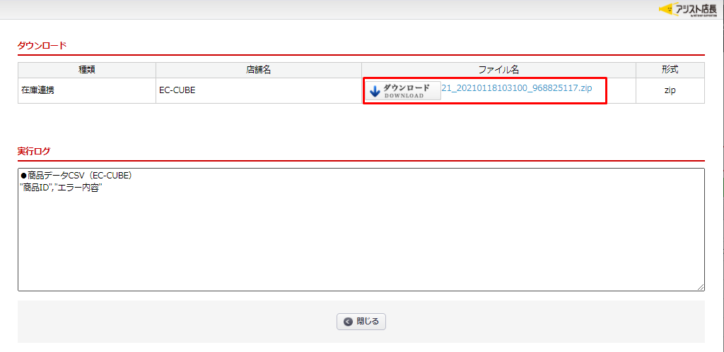右下の【ダウンロード】ボタンより在庫連携用CSVファイルをダウンロードします。