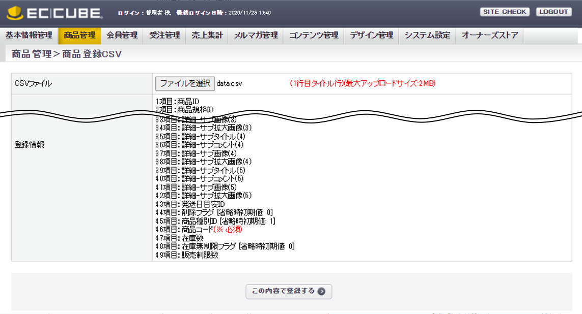 商品管理>商品登録CSV にてアップロードするファイルを選択します。