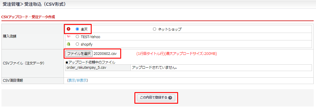 「購入店舗」を選択すると「CSVファイル(注文データ)」形式が店舗指定の項目情報に切替ります。