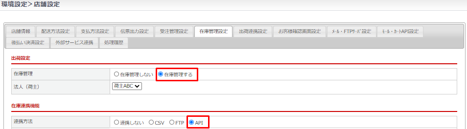 ※自動で在庫連携を行う場合は、環境設定>店舗設定>「在庫管理設定」タブ にて