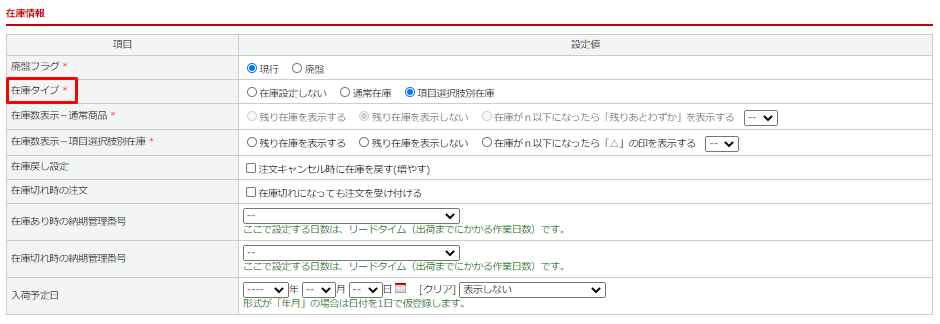- 廃盤フラグや在庫数表示など必要項目を記入してください。