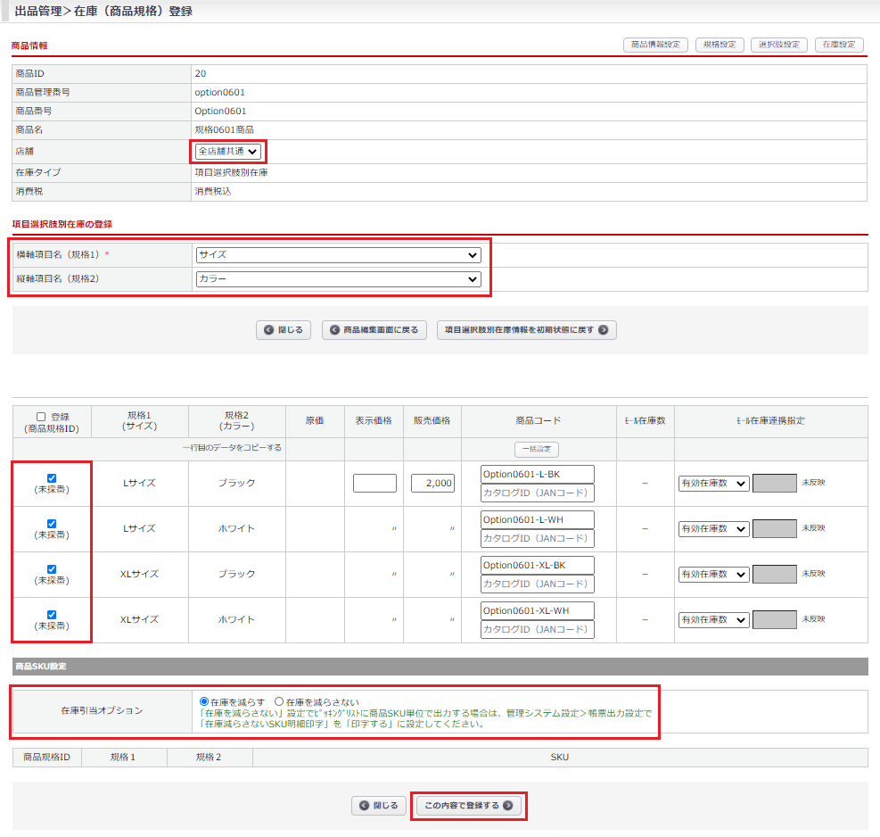 商品SKU登録画面へ反映され、【この内容で登録する】ボタンをクリックすると