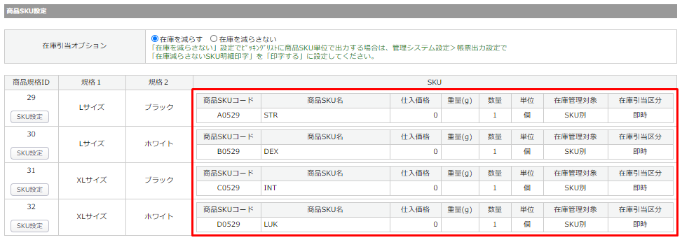 ※商品SKUは「在庫管理>商品単品(SKU)一覧」の【商品SKUの新規登録】にて登録してください。