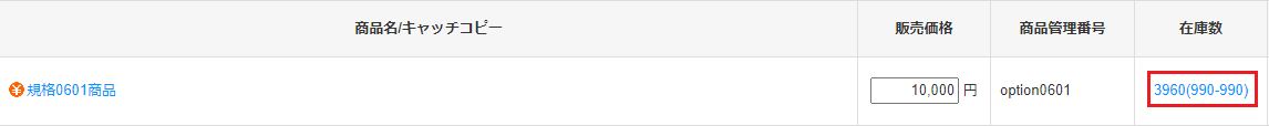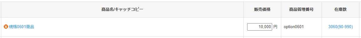 「在庫数」には、項目選択肢別の在庫設定をした中で”最小値~最大値”が表示されます。