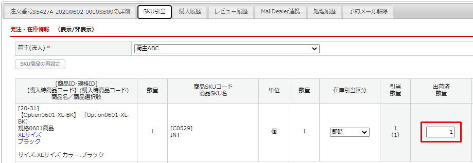 また「SKU引当」タブにて、出品商品に紐づいた商品SKUの在庫が引当されます。