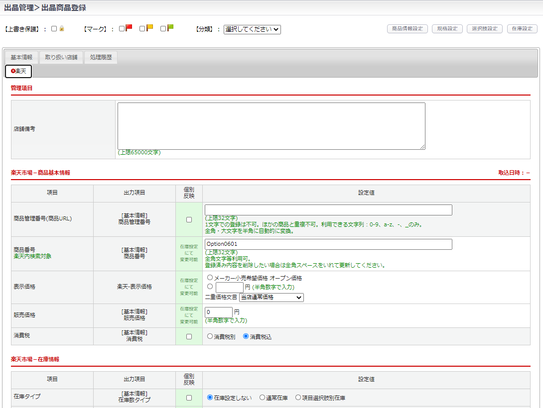 商品管理番号(商品URL)や在庫タイプの個別反映が行えます。