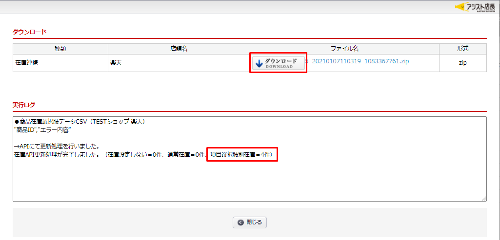 実行結果画面にて連携したデータファイルと実行ログをご確認いただけます。