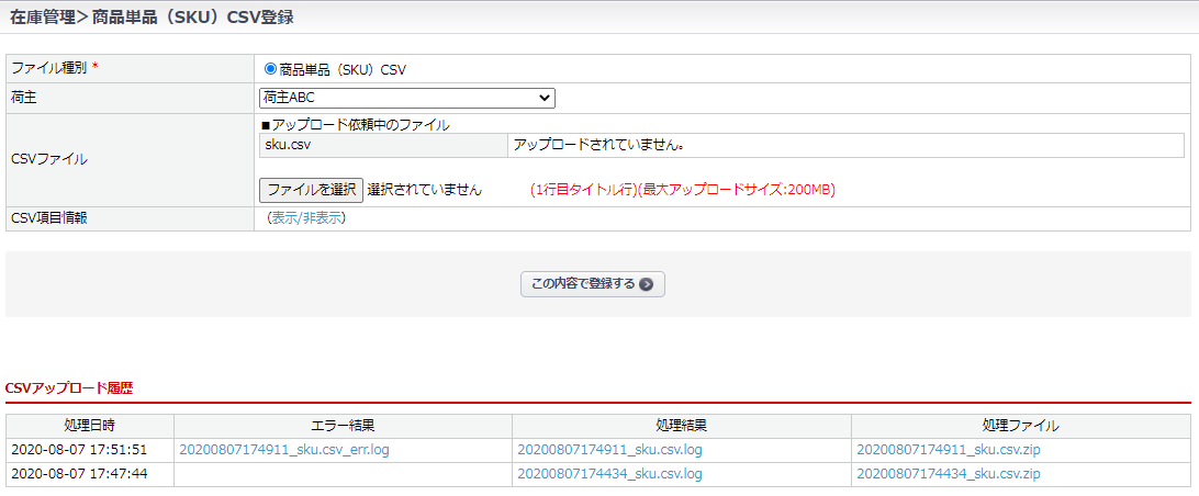 CSVアップロードが完了後は、「CSVアップロード履歴」にて処理結果をご確認いただけます。