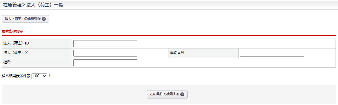 在庫を管理する法人(荷主)の検索や登録・変更、CSVデータファイルのダウンロードを行います。
