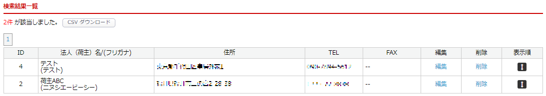 「法人(荷主)一覧」の検索結果一覧にて法人(荷主)情報が表示されます。