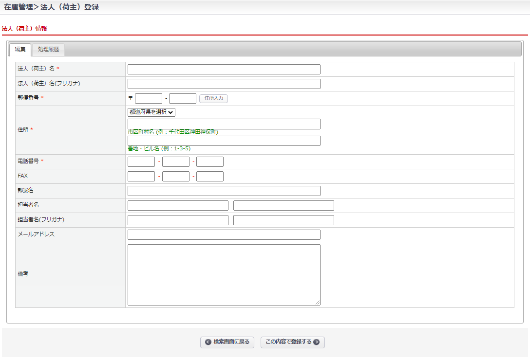 | 法人(荷主)名 * | 法人(荷主)名を入力します。 主に出品管理や在庫管理の設定に利用します。 |