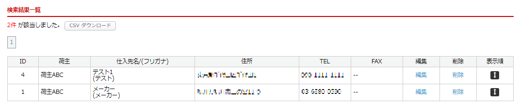 「仕入先一覧」の検索結果一覧にて仕入先情報が表示されます。